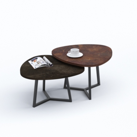 PLECTRA Dual Triangular Coffee Table innovatively crafted for modern environments embracing both fluidity and movement. Since this type strategically combines 2 copies of PLECTRA coffee tables, it introduces interlocking triangular forms. They both feature a gently rounded triangular top of elegant Egger laminate H1307 ST19 Brown Warmia Walnut finishing. In a darker tone along with matte lacquer it showcases a stone-textured surface. Since these Egger MDF boards feature an antibacterial surface property, PLECTRA triangular coffee table hinders germs growth yet easy to maintain and clean. Combining it with black powder coated steel base creates a dynamic centerpiece effortlessly sparking conversation.