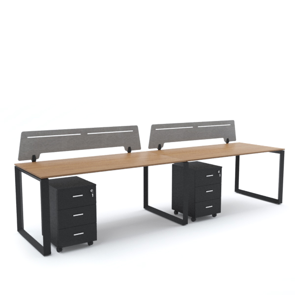 As a functional modular corporate workstation of 2 desks, a mobile wooden pedestal of 3 vertically stacked lockable drawers per person also fits underneath. Basically, it offers personalized storage section. Additionally, concrete grey PET acoustic panels also fixed on the desk table top for an insolation and private workspace. Round grommets strategically placed in corners offer a well thought-out cable management solution. Once you get a workstation desk combining a simplified storage with cable management, surely guarantees an uncluttered workspace.